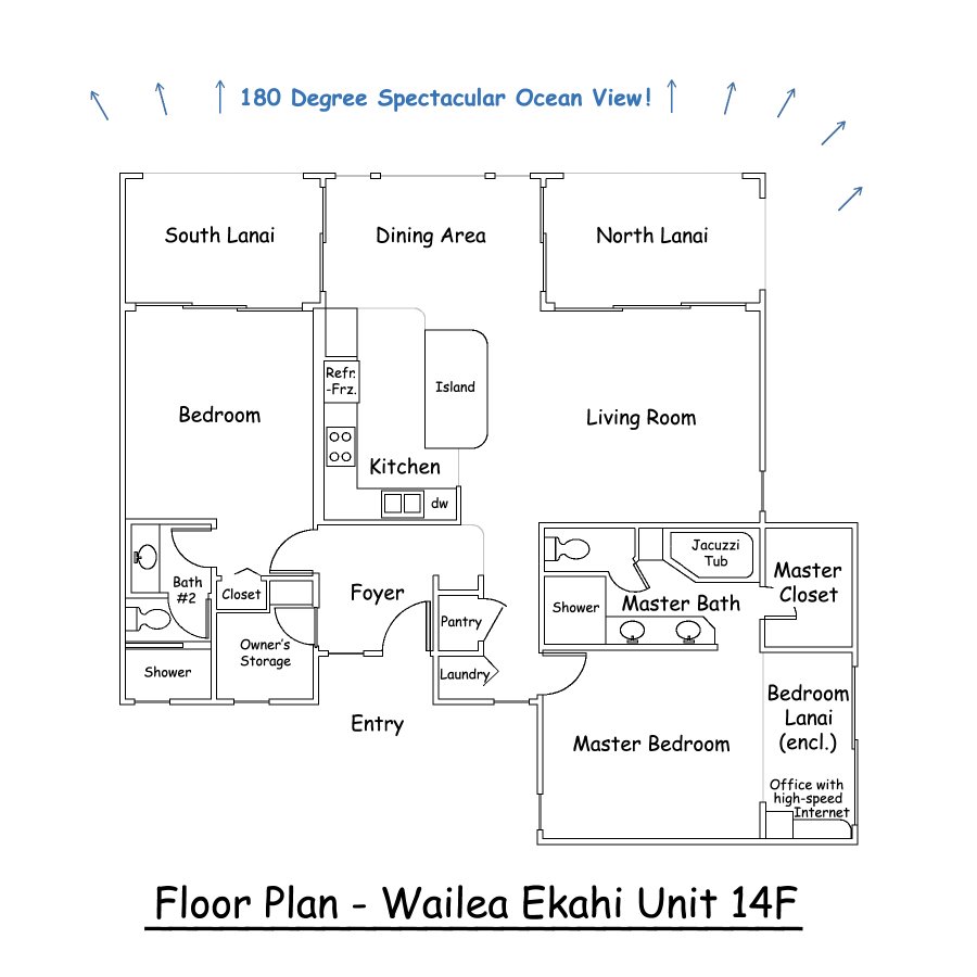 Ekahi 14F is a professionally decorated, luxurious 2-bedroom condo with a breathtaking 180-degree ocean view, situated in a quiet tropical garden setting far from road and pool noise. Graced with beautiful local artwork, with baths and gourmet kitchen countertops in gorgeous slab marble and granite, limestone floors, cathedral ceilings, and even a Japanese-style deep soaking Jacuzzi tub, Ekahi 14F is truly luxury in paradise for four discriminating adults.